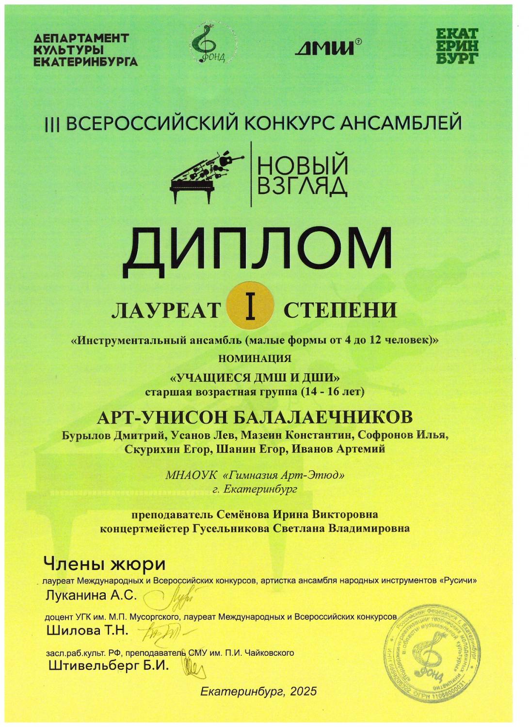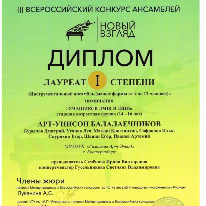 23 ноября в обновленной Детской музыкальной школе №7 имени С.В.Рахманинова обучающиеся  по дополнительной предпрофессиональной программе  «народные инструменты» Гимназии «Арт-Этюд» Бурылов Дмитрий, Усанов Лев, Софронов Илья, Шанин Егор, Скурихин Егор, Иванов Артемий и выпускник Мазеин Константин успешно выступили на конкурсе. Высокая награда - достойное завершение 5-ти летнего периода творческой деятельности ансамбля.