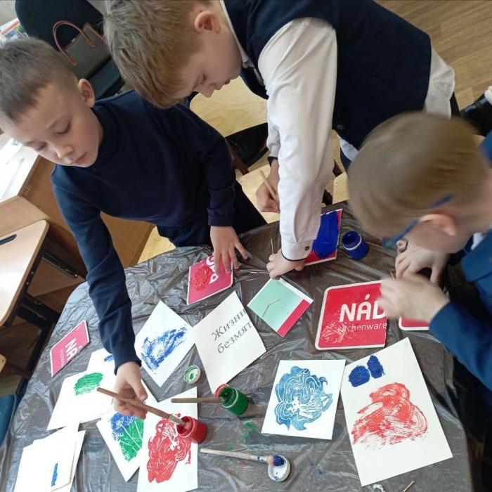 Также ребята попробовали себя в качестве печатников. На готовые гравюры наносили краску и делали на бумаге оттиски. Картинки у всех получились разные! Ведь каждый наносил краску на эстамп по своему вкусу. Потом ребята пробовали на ламинированном картоне с помощью зубочистки выдавливать рисунок, покрывать краской и делать отпечаток на бумаге. И снова получились изумительные рисунки!