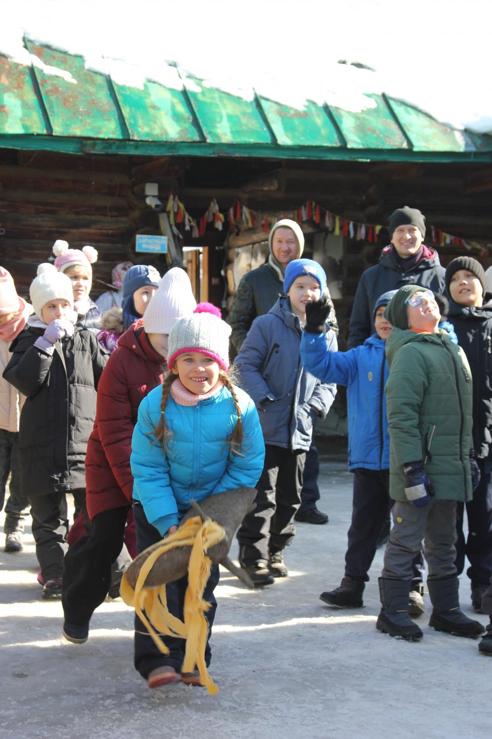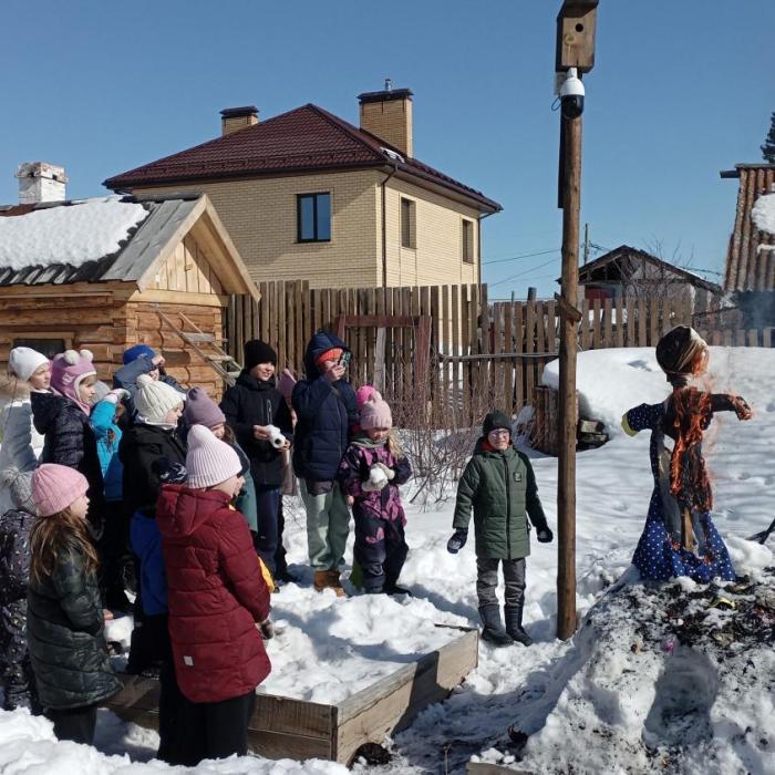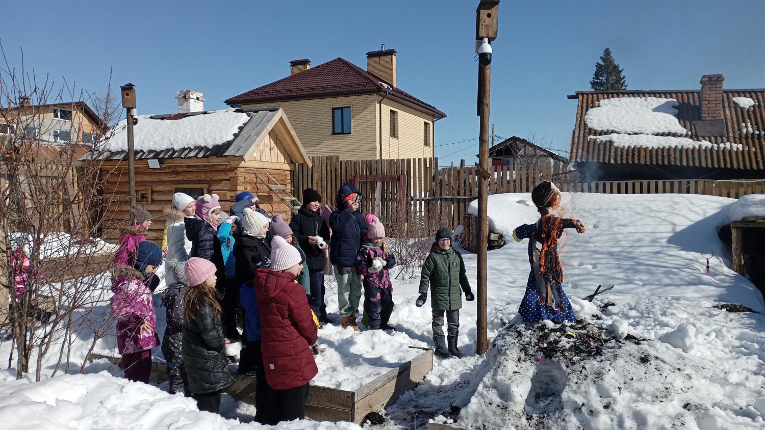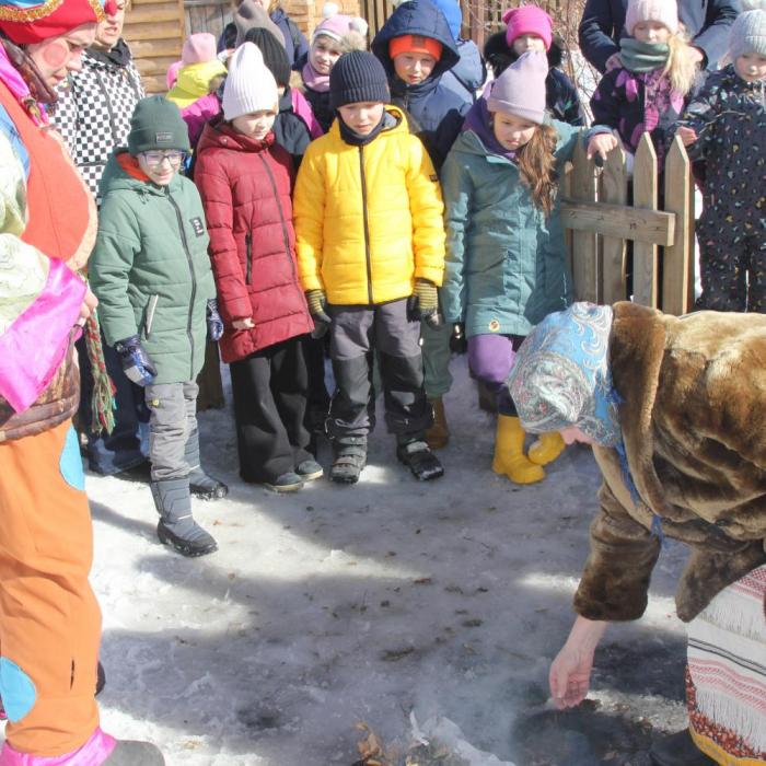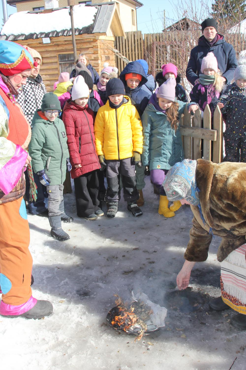 После экскурсии на большом дворе ребята поиграли в народные игры, мальчики и девочки соревновались в перетягивании каната. Но самым ярким впечатлением стало сжигание чучела Масленицы и закидывание её снежками, нашептывание на веник бед и неудач и прыжки через костёр, в котором горит этот веник.