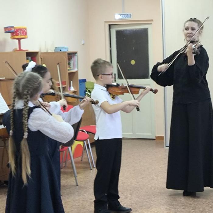 Юные музыканты познакомили малышей со своими музыкальными инструментами.В зале детского сада звучали домра, скрипка, баян и фортепиано.